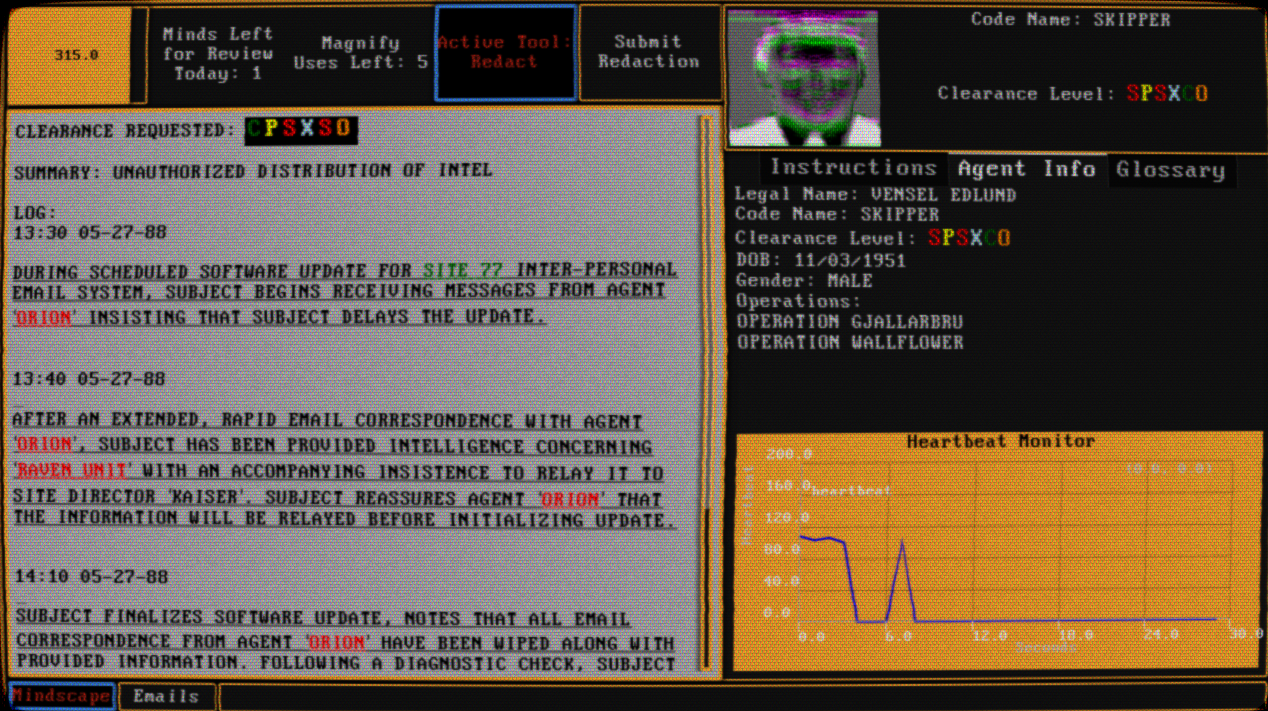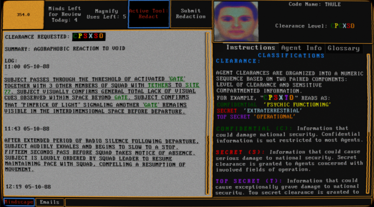 The year is 1988. The noosphere of Earth humanity's collective unconscious has awakened, directly affecting reality with miracles and nightmares alike. In the midst of a Cold War turned psionic, a shadowy organization has found a 'Gate' to 'Elysium', an unknown world rife with opportunities to gain an edge against those who would see NATO brought low. Your purpose is to ensure KETER's agents remain at their best through the use of newly developed psi-technology allowing access to their very minds as they rest. Identify discrepancies in their behavior, flag down unnecessary memories for corrective action, and look within their deepest secrets. Be warned: if you cannot assist the agent in time, the resulting shattering of their psyche will be on your hands.